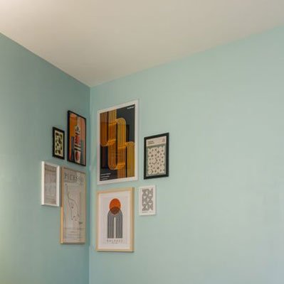 Les murs bleu pastel sont agrémentés d’un assortiment de cadres modernes,