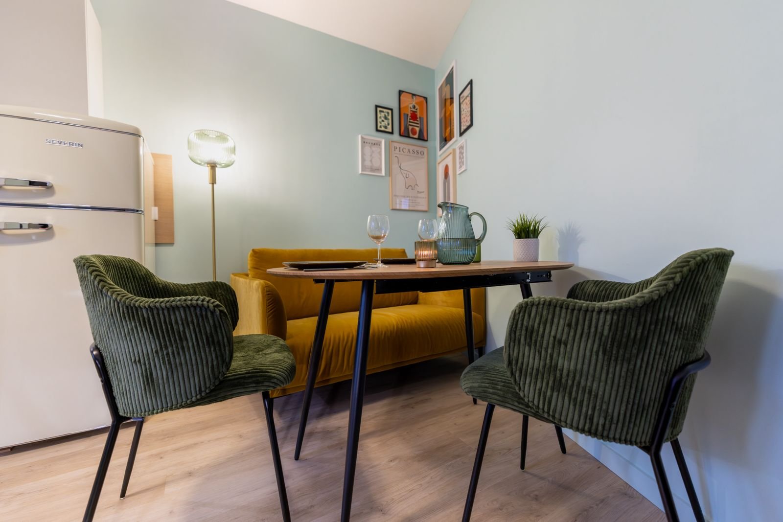 est équipée de manière complète avec des appareils modernes, dont un micro-ondes encastré, une machine à laver discrètement intégrée et un réfrigérateur rétro au charme intemporel. Le plan de travail clair et les éléments de rangement blancs ajoutent une touche épurée, tandis que les détails en bois créent une atmosphère conviviale. Le coin salon est dominé par un canapé en velours jaune moutarde, apportant une touche vibrante et accueillante. À côté, un espace repas composé d’une table ronde en bois et de chaises vertes en velours offre un cadre intime et élégant pour les repas ou les moments de détente.